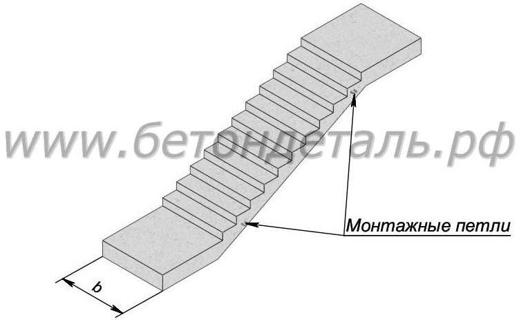 Железобетонный лестничный марш (ЛМП) армируется сварными сетками и каркасами из стержневой арматуры и проволоки. Конструкцией лестничного марша ЛМП предусмотрено наличие монтажных петель и закладных изделий для лестничных перил и ограждений. Масса готового изделия составляет 1700 кг.