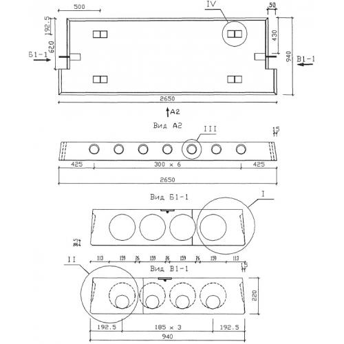 Плиты длиной 2650 мм и шириной 940 мм связевые с арматурой из стали классов  A-III  и Bp-I из тяжелого бетона.